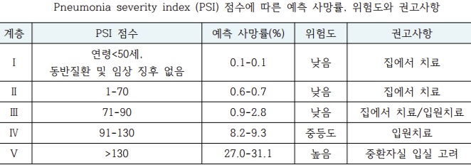 다음 지표는 폐렴 단계를 확인을 할 수 있는 폐렴 중증도지표(pneumonia severity index, PSI)이며 IV, V군은 심각한 단계로 입원 및 중환자실 치료를 필요로 합니다.