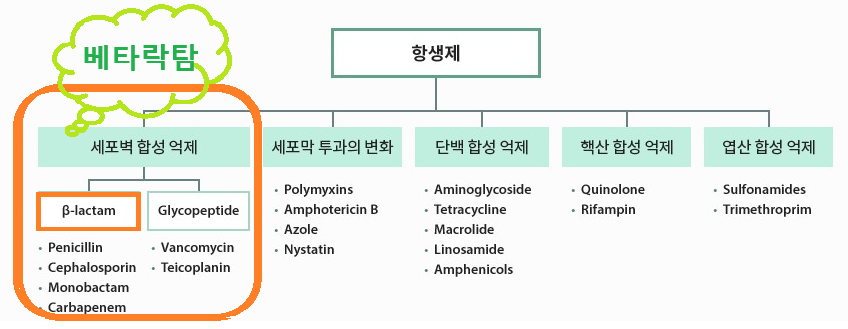 베타락탐계 항생제는 화학구조상 3개의 탄소원자와 1개의 질소 원자로 이루어진 이종원자 환평 고리 항생물질로 세균 세포벽 합성을 방해하는 항균력을 가집니다.