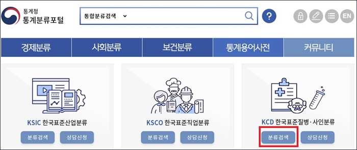 질병분류코드는 통계청 자료에 있는 통계분류 포털 검색으로 확인할 수 있으며