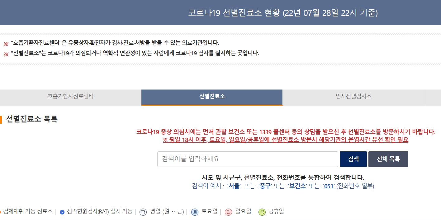 임시선별검사소와 선별 진료소 목록과 운영시간은 다음에 안내된 보건복지부 홈페이지에 들어가면 확인할 수 있습니다. 코로나19가 의심되거나 역학적 연관성이 있는 사람에게 코로나19 검사를 실시하는 선별 진료소, 임시 선별 검사소, 자동차 이동형 선별 진료소를 비롯하여 코로나19 유증상자·확진자가 검사·진료·처방을 받을 수 있는 의료기관인 호흡기환자진료센터 현황을 볼 수 있습니다. 다음 그림 코로나19 선별 검사소 현황을 클릭하면 우리동네 코로나 검사하는 곳을 간단히 알수 있습니다.